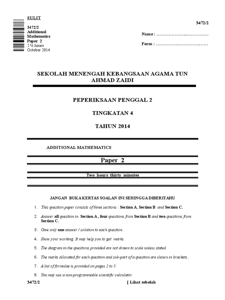 Spm Additional Mathematics Examination Format Since Additional Mathematics Examination Format Since 2003 Paper 1 4 2 2 Functions Integration Differentiation 6 Format Peperiksaan Spm Add Math
