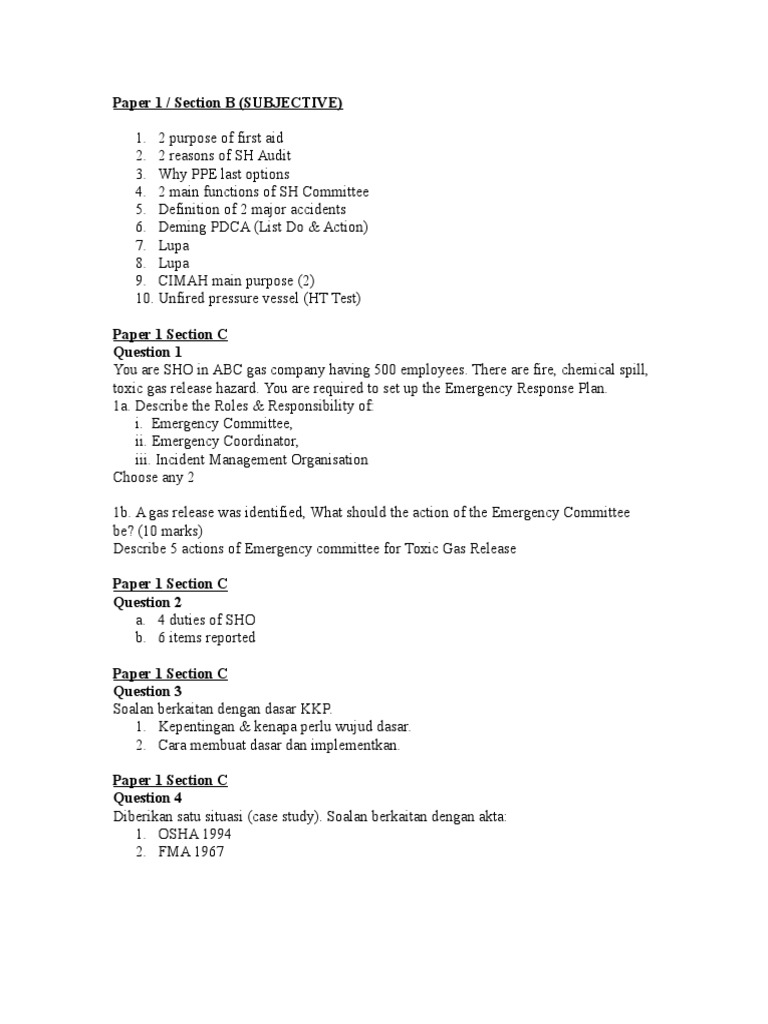 Exam Sho Paper 1 Section A And B Occupational Safety And Health Administration Occupational Safety And Health
