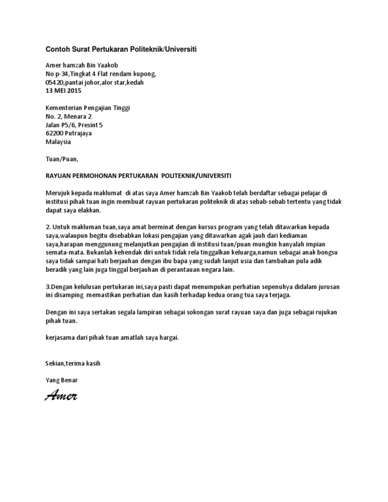 Contoh Surat Rayuan Pertukaran Egtukar