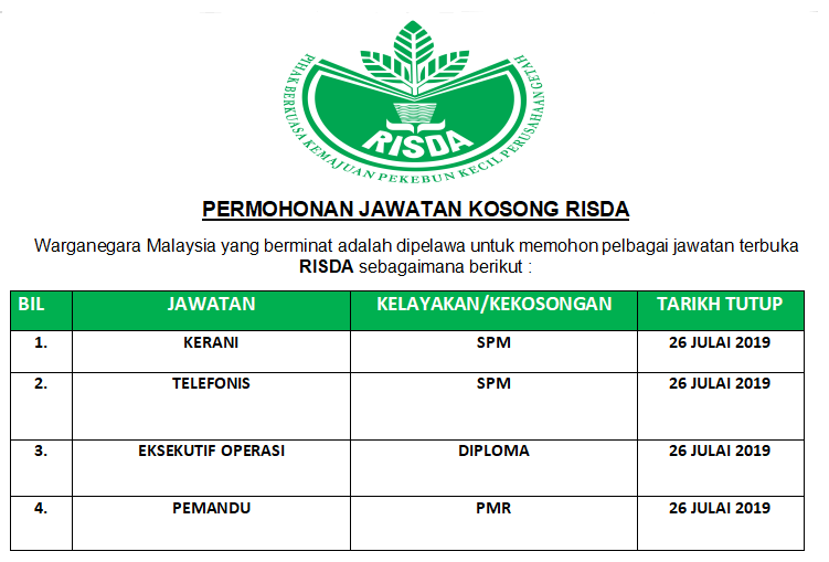 Jawatan Kosong Terkini Risda Pengambilan Kerani Penyelia Pemandu Eksekutif Operasi Di Buka Kerja Kosong Kerajaan Swasta