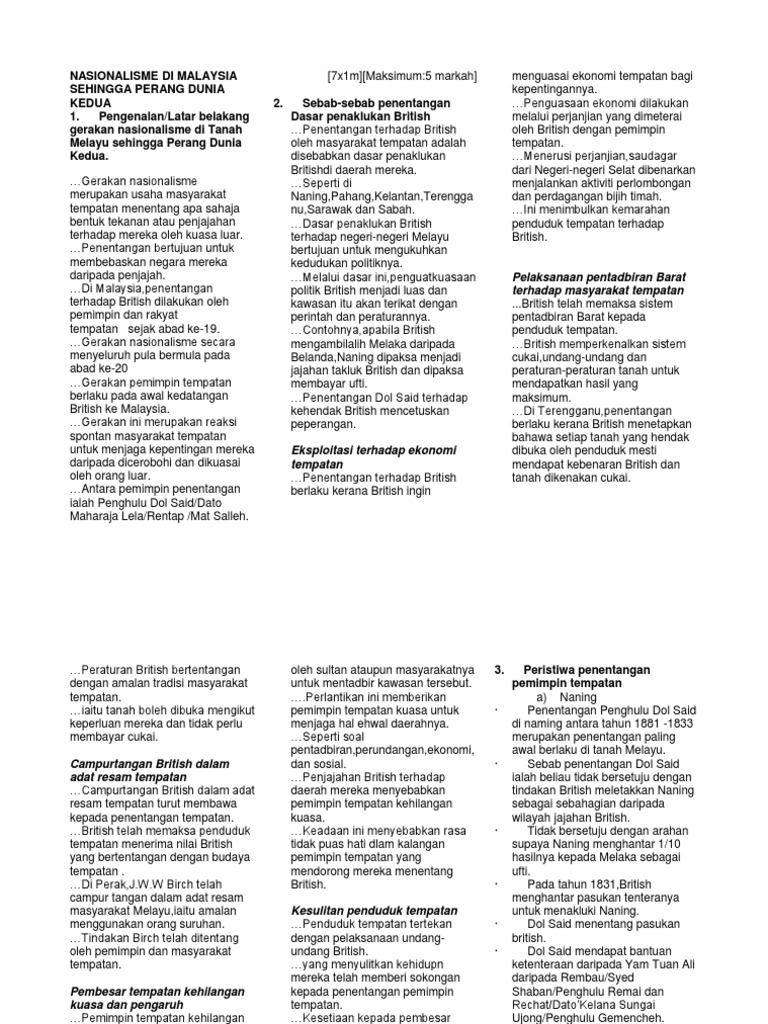 19287803 Nota Sejarah Tingkatan 5 Bab 2 Nasionalisme Di Malaysia Sehingga Perang Dunia Kedua Pdf Document